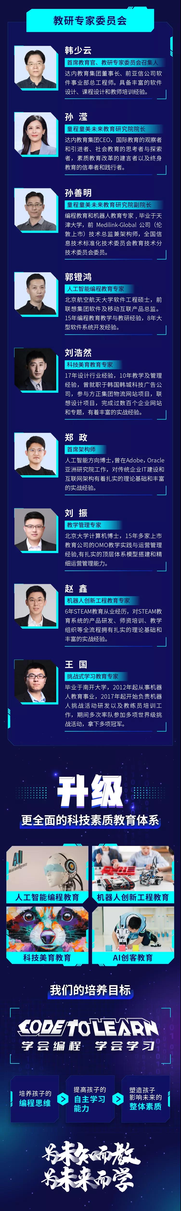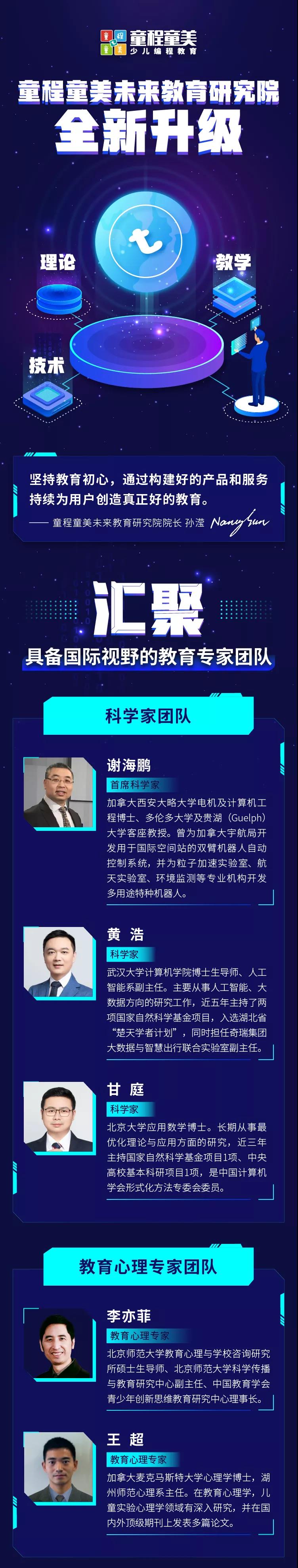全新升級的童程童美未來教育研究院匯集了來自計算機軟件工程、人工智能、大數(shù)據(jù)與深度學(xué)習(xí)、機器人工程、教育與教育心理學(xué)等多個領(lǐng)域的專家學(xué)者,形成了科學(xué)家團隊、教育心理專家團隊以及教研專家委員會,共三類專家序列。“研究院”組建了科學(xué)家團隊,負(fù)責(zé)前沿科學(xué)技術(shù)支持,其中首席科學(xué)家為加拿大西安大略大學(xué)電機及計算機工程博士謝海鵬。作為資深的機器人技術(shù)專家,謝海鵬博士曾為加拿大宇航局開發(fā)用于國際空間站的雙臂機器人自動控制系統(tǒng)。此外,謝海鵬博士也為粒子加速實驗室、航天實驗室、環(huán)境監(jiān)測等專業(yè)機構(gòu)開發(fā)多用途特種機器人,并在多倫多大學(xué)及貴湖(Guelph)大學(xué)擔(dān)任客座教授。同時加入科學(xué)家團隊的專家學(xué)者還有武漢大學(xué)計算機學(xué)院博士生導(dǎo)師、人工智能系副主任黃浩,以及北京大學(xué)應(yīng)用數(shù)學(xué)博士甘庭。其中,黃浩博士主要從事人工智能、大數(shù)據(jù)方向的研究工作,近五年主持了兩項國家自然科學(xué)基金項目,入選湖北省“楚天學(xué)者計劃”,同時擔(dān)任奇瑞集團大數(shù)據(jù)與智慧出行聯(lián)合實驗室副主任。甘庭博士長期從事最優(yōu)化理論與應(yīng)用方面的研究,近三年主持國家自然科學(xué)基金項目1項、中央高?;究蒲许椖?項,是中國計算機學(xué)會形式化方法專委會委員。童程童美未來教育研究院還組建了教育心理專家團隊,邀請了北京師范大學(xué)教育心理與學(xué)校咨詢研究所碩士生導(dǎo)師、北京師范大學(xué)科學(xué)傳播與教育研究中心副主任、中國教育學(xué)會青少年創(chuàng)新思維教育研究中心理事長李亦菲,以及加拿大麥克馬斯特大學(xué)心理學(xué)博士王超,擔(dān)任教育心理專家團隊的專家成員。教研專家委員會由達內(nèi)教育集團董事長、首席教育官韓少云擔(dān)任召集人,委員會成員有童程童美未來教育研究院院長孫瀅、童程童美未來教育研究院副院長孫善明、人工智能編程教育專家郭鐙鴻、科技美育教育專家劉浩然、首席架構(gòu)師鄭政、教學(xué)管理專家劉振、機器人創(chuàng)新工程教育專家趙鑫,以及挑戰(zhàn)式學(xué)習(xí)教育專家王國。“未來,我們還將吸納更多方的力量,從更專業(yè)的角度和更深層次的方向,尋求前沿科技、教育理論與教學(xué)實操的碰撞與融合,賦能科技素質(zhì)教育高質(zhì)量發(fā)展。”童程童美未來教育研究院院長孫瀅表示。引入國內(nèi)外優(yōu)質(zhì)教育資源在拓展專家團隊的同時,“研究院”也通過與各類專業(yè)機構(gòu)的合作,將更多國際上的優(yōu)質(zhì)教育資源引入中國,賦能中國孩子。目前,童程童美已經(jīng)與RoboRAVE國際教育機器人大會、Botball國際教育機器人大會、VEX等國際知名的機器人挑戰(zhàn)活動主辦方達成合作,未來將持續(xù)助力更多中國孩子走上國際挑戰(zhàn)舞臺,拓展國際視野,進行全球范圍內(nèi)的科普交流。與此同時,童程童美也與華為云成為戰(zhàn)略合作伙伴,用科技賦能教育教學(xué),促進教育信息化發(fā)展,共同助力智慧教育的融合與創(chuàng)新。此外,童程童美母公司達內(nèi)教育與Adobe、Spring、360、快手等國內(nèi)外知名企業(yè)建立了合作關(guān)系,這些國內(nèi)外的優(yōu)質(zhì)資源未來將更高效地為童程童美的學(xué)員賦能。產(chǎn)品體系與培養(yǎng)目標(biāo)升級學(xué)會編程,學(xué)會學(xué)習(xí)在此基礎(chǔ)上,童程童美未來教育研究院構(gòu)建了全新的科技素質(zhì)教育產(chǎn)品體系,繼續(xù)打造一站式、全鏈路的人工智能編程教育以及機器人創(chuàng)新工程教育,推出了科技美育教育。未來,童程童美還將更加重視前沿科學(xué)技術(shù)與教育場景的結(jié)合,聚焦科技素質(zhì)教育的實踐性發(fā)展,例如將基于AI的視覺識別、以及人臉識別等前沿技術(shù)落實到真實的教學(xué)場景當(dāng)中,真正做到用科技賦能教育。與此同時,童程童美未來教育研究院提出了全新的科技素質(zhì)教育理念,同時也是培養(yǎng)目標(biāo):CODE TO LEARN——學(xué)會編程,學(xué)會學(xué)習(xí)。其中,“學(xué)會編程”不是指學(xué)習(xí)編寫計算機程序,而是讓孩子掌握編程思維。編程思維在本質(zhì)上是一個發(fā)現(xiàn)問題和解決問題的過程。在學(xué)習(xí)編程的過程中,孩子需要對一個項目或任務(wù)進行深入的研究和分析。為了實現(xiàn)某個功能,可以將功能點拆分為多個小模塊逐一解決。并在最后對任務(wù)進行調(diào)試和改錯,不斷迭代最優(yōu)方案,實現(xiàn)自我修正。事實上,編程思維就是一種學(xué)習(xí)能力。任何新知識均可以采用這種問題分解的方式,從點到面的學(xué)習(xí)。所以,學(xué)習(xí)編程不是目的,它僅僅是一種手段,幫助孩子提升自主學(xué)習(xí)能力,學(xué)會學(xué)習(xí)。在一個終身學(xué)習(xí)的時代,學(xué)會學(xué)習(xí)是作為21世紀(jì)人才的“標(biāo)配”。不管孩子未來從事何種職業(yè),自主學(xué)習(xí)能力與他未來的生存和發(fā)展息息相關(guān)。通過學(xué)習(xí)編程,提升孩子的自主學(xué)習(xí)能力,培養(yǎng)孩子的邏輯思維能力、表達能
