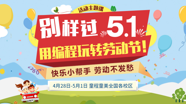 童程童美推出五一主題活動課——用編程玩轉(zhuǎn)勞動節(jié)!闖關(guān)贏童幣,趣味學(xué)編程,幸運大抽獎,好禮送不停!活動時間:2018年4月28日-5月1日,童程童美全國校區(qū)火爆開啟!