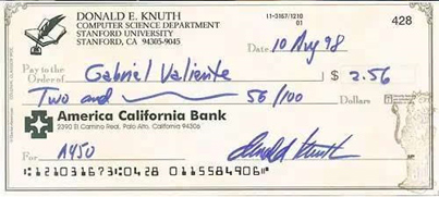 此外,他還為TEX系統(tǒng)設立了獎金,第一個發(fā)現(xiàn)系統(tǒng)漏洞的人,可以獲得2.56美金;  第二個人可以獲得5.12美金。依此類推,我們都知道,傳說某個國王就因為這種指數(shù)游戲,失去了江山,也有人嘲笑微軟,說比爾蓋茨再有錢,如果每有一個bug就賠錢,他早就傾家蕩產(chǎn)了。高德納作為算法大師,更清楚指數(shù)增長的可怕性。然而到現(xiàn)在為止,他只寄出過兩張支票,可見他對完美的追求有多么極致。